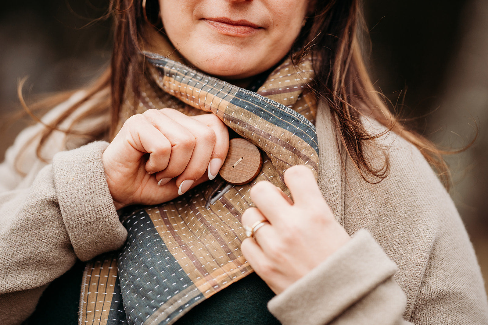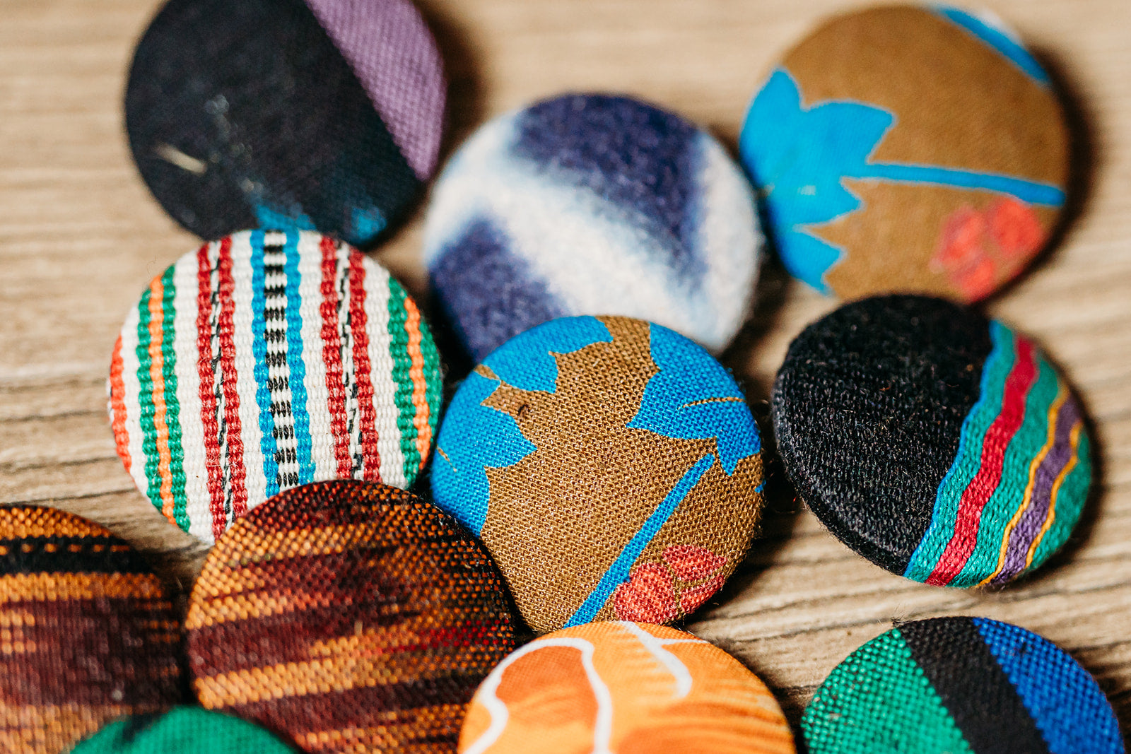Upgrade your wardrobe with our unique and sustainable handpressed buttons, crafted from recycled fabric.