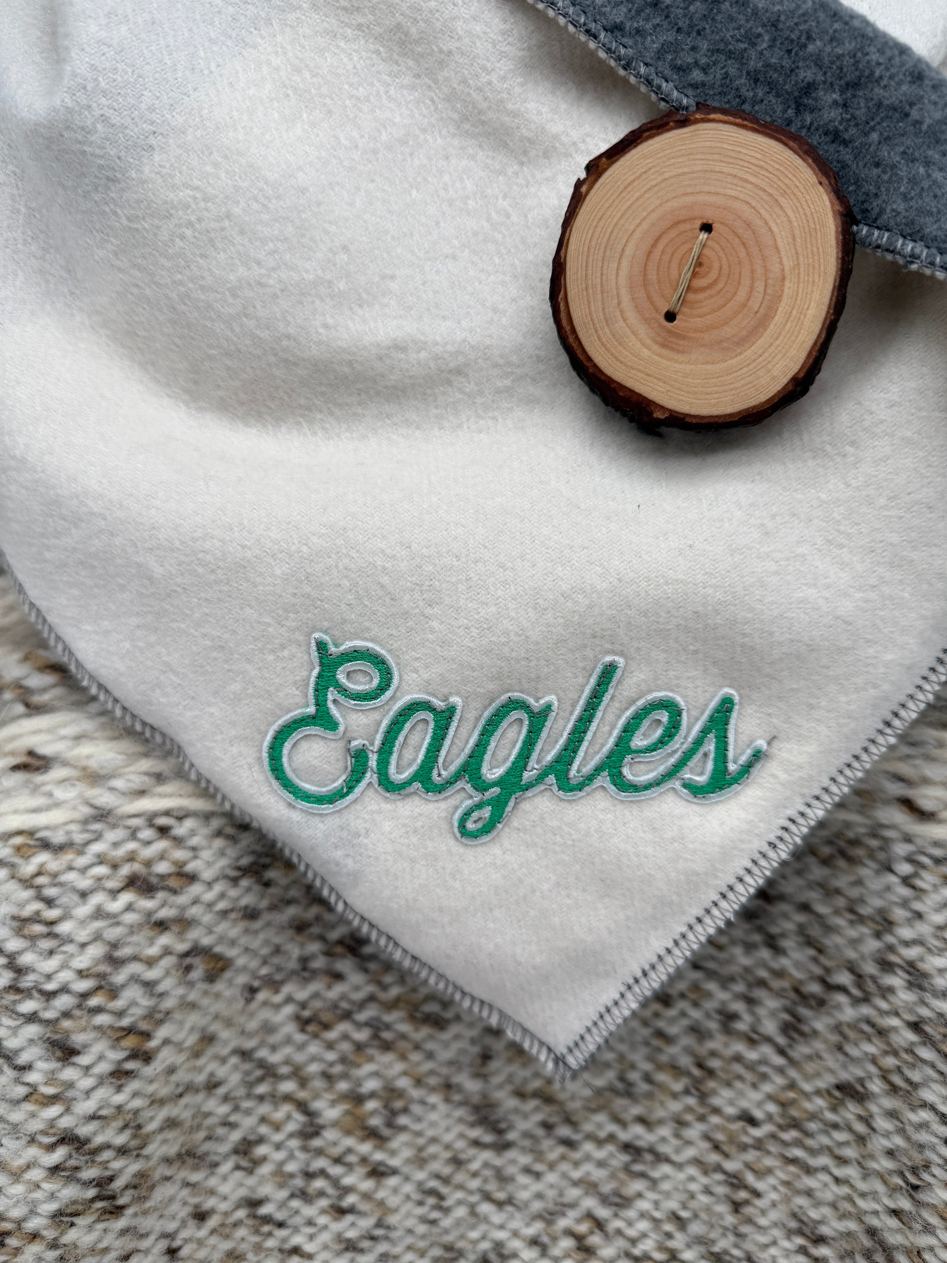This piece is crafted with care, using Upcycle outer fabric. The inner liner is made from soft, grey fleece for maximum warmth and comfort. No two are exactly alike—this features a unique accent patches representing our own E-A-G-L-E-S.