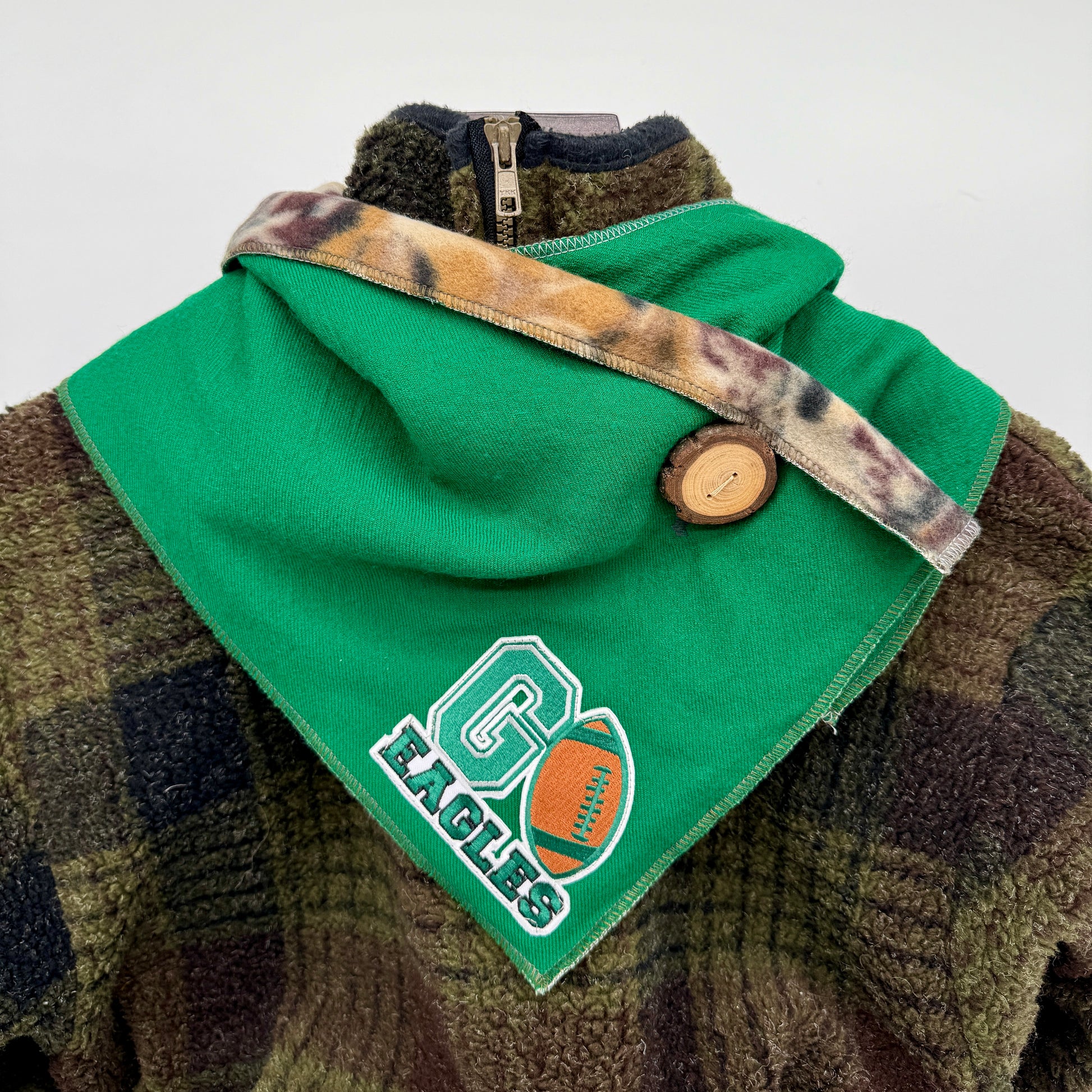 This piece is crafted with care, using Kelly Green outer fabric. The inner liner is made from soft, camo fleece for maximum warmth and comfort. No two are exactly alike—this features a unique accent patches representing our own E-A-G-L-E-S.