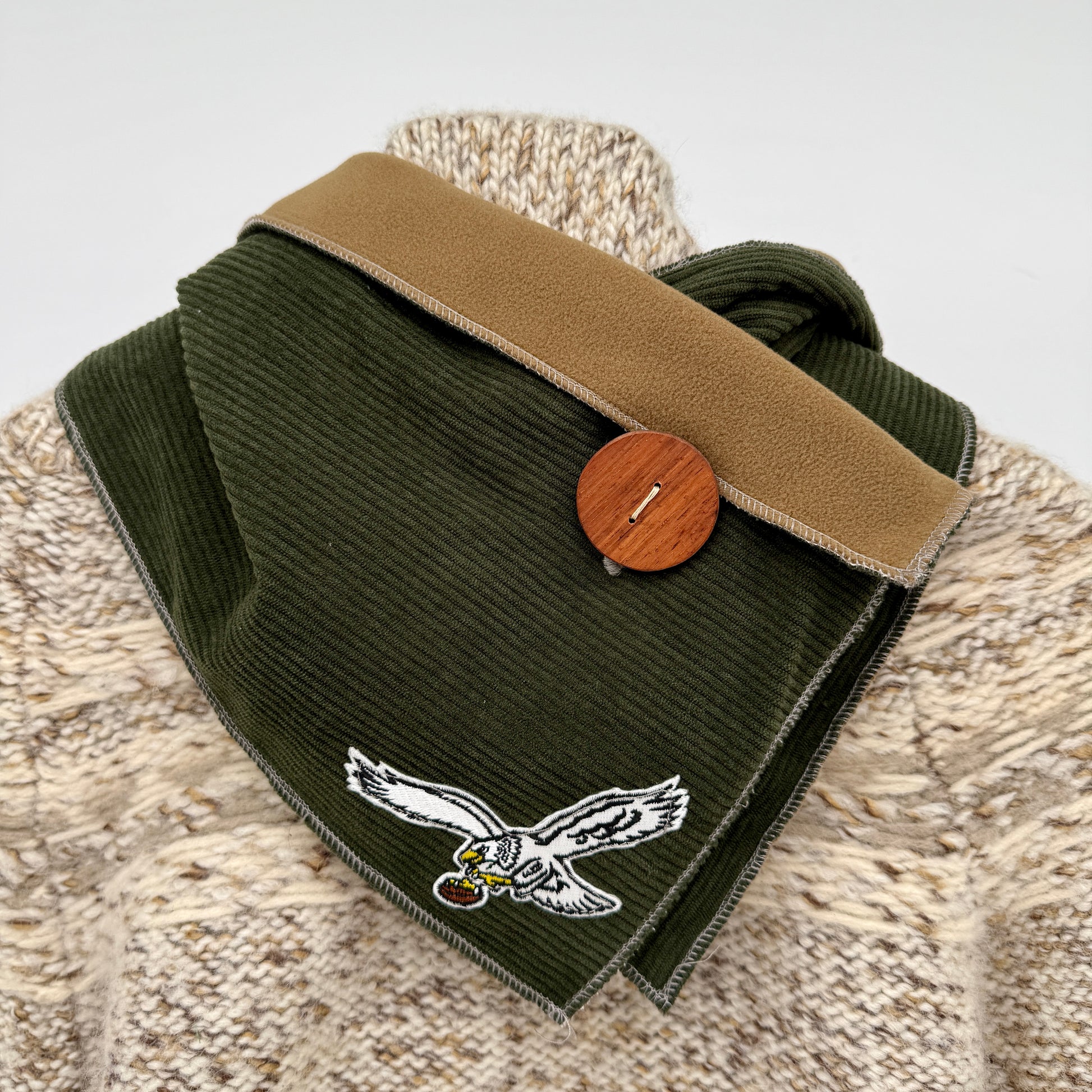 Show your Philly pride while staying cozy and eco-conscious! Our handmade upcycled neck warmers are part of a special limited edition drop featuring stylish nods to the Eagles.