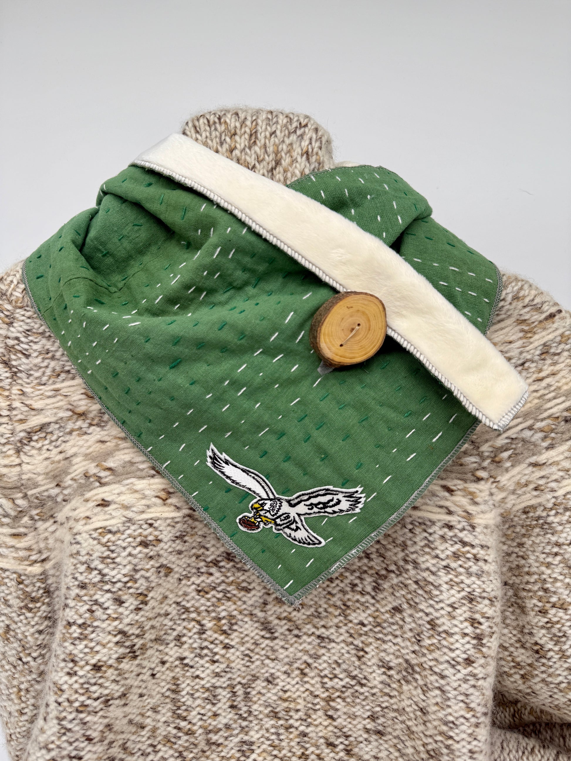 Show your Philly pride while staying cozy and eco-conscious! Our handmade upcycled neck warmers are part of a special limited edition drop featuring stylish nods to the Eagles.